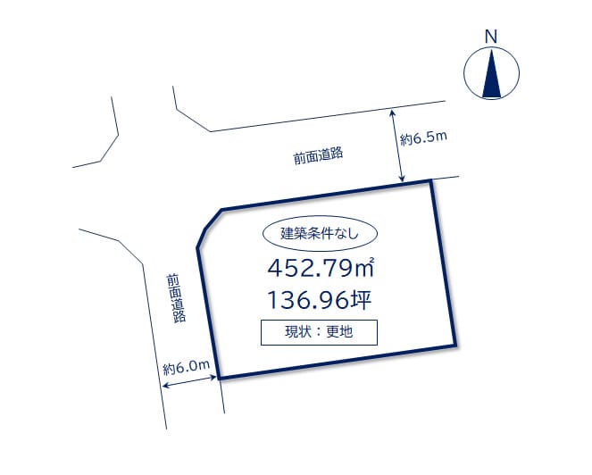 | 接道状況 | 方角:北 道路幅員:6.5m 公私区分:公道 方角:西 道路幅員:6m 公私区分:公道 |
