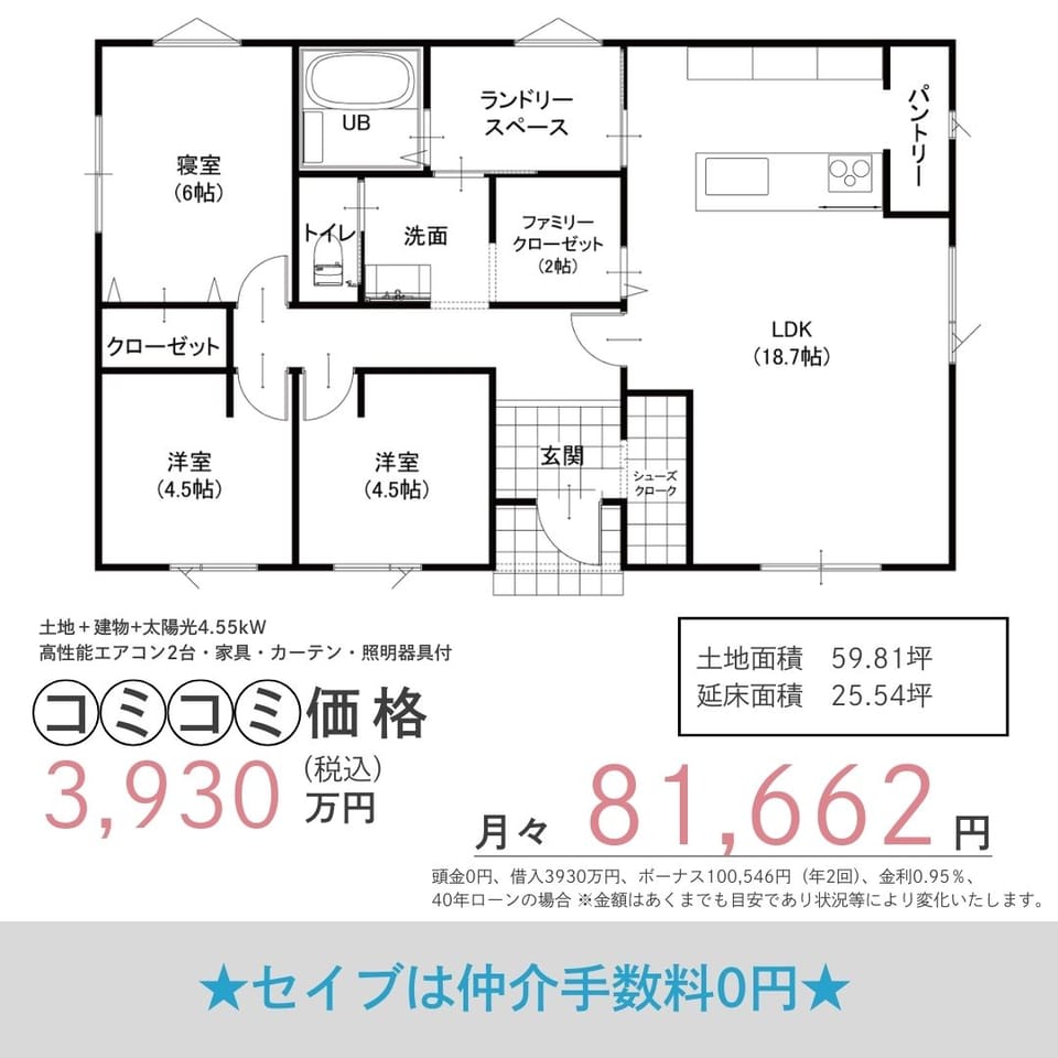- 間取3SLDK(太陽光発電搭載&高断熱の平屋)