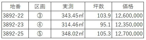 | 備考 | 電柱・支線・支柱がたつ区画があります。③~⑤区画は建築条件のない建売住宅です。表示する距離等は対象施設の最近点で計測しています。位置情報にてご確認お願いします。現道と造成土地の高さはほぼ等高です。浸水想定区域は想定最大50㎝未満 |