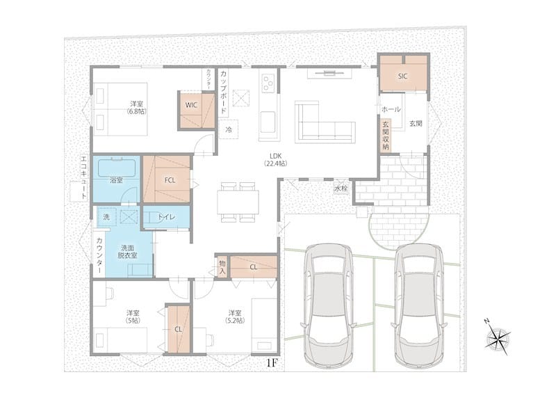 | 設備 | システムキッチン・IHクッキングヒーター・食器洗浄乾燥機・TVモニタ付きインターホン・ディンプルキー・火災警報器(報知機)・暖房便座・オートバス・バス1坪以上・エアコン・ウォークインクローゼット・24時間換気システム・オール電化・給湯・洗髪洗面化粧台・上水道・下水道・電気・駐車場2台分 |