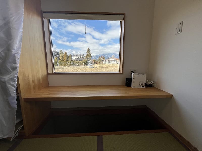 更にLDKの続き間、和室からも同様の眺望が楽しめます。リビング南のデッキへ出て梯子階段を上ると、少し高い位置にスカイデッキもあります。こちらで寛ぎながら北アルプスの眺望を楽しみお酒を飲む。そんな日常もこちらの物件では実現できます。