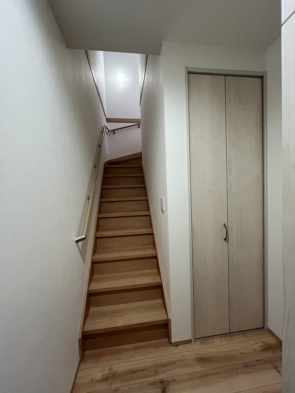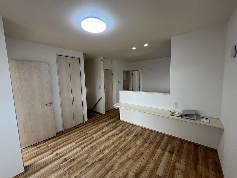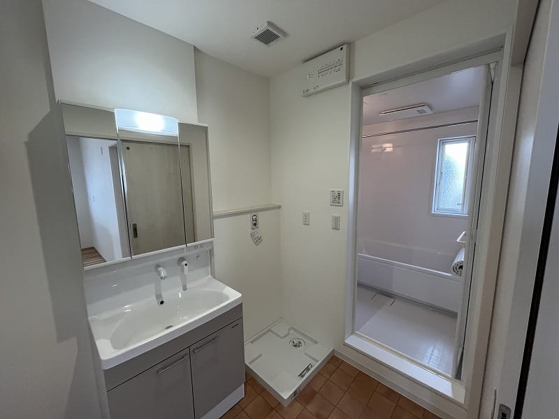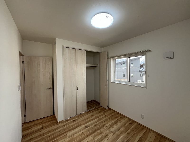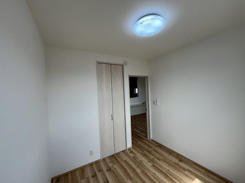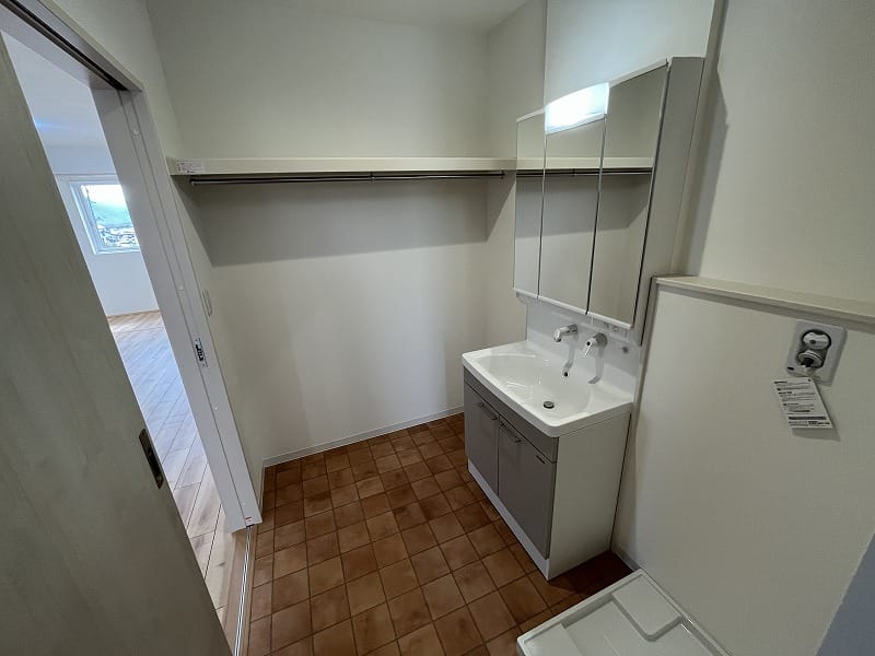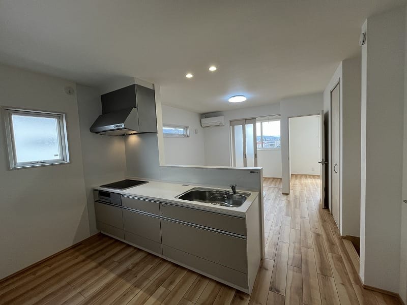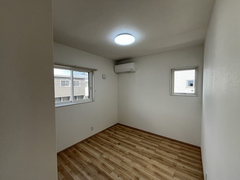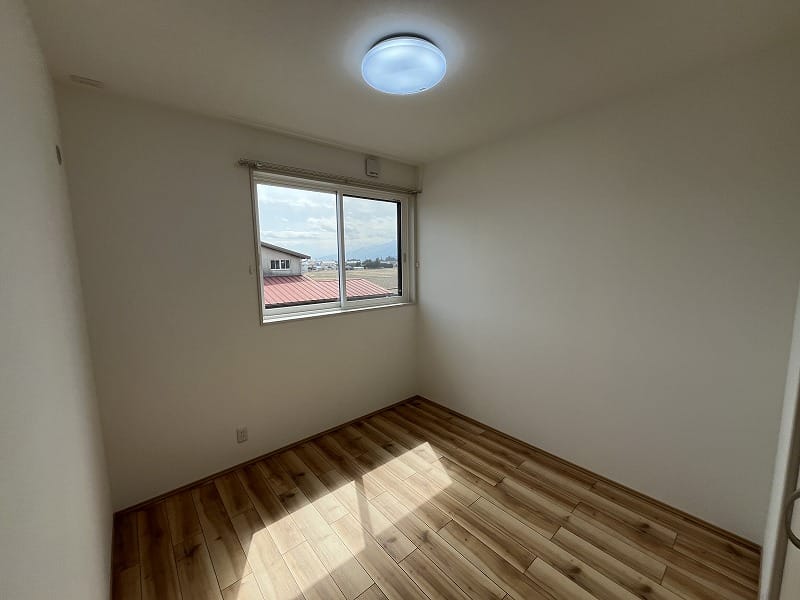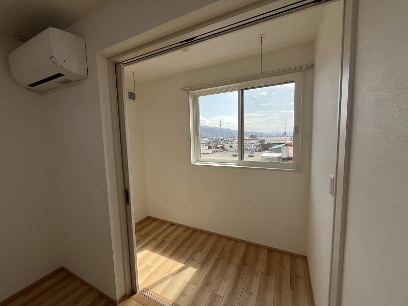 キッチンは注文住宅と同じ2.55m巾のキッチンで、ゆったりと料理が出来ますし、洗面脱衣室は少し広めにパイプ付き収納棚がありまして、ゆとりがあります。エアコンは寒冷地用の暖房パワーのある上位機種が2台備え付けられており、建物の基本性能と合わせて、寒い冬の信州でも暖かくお過ごし頂けます!!